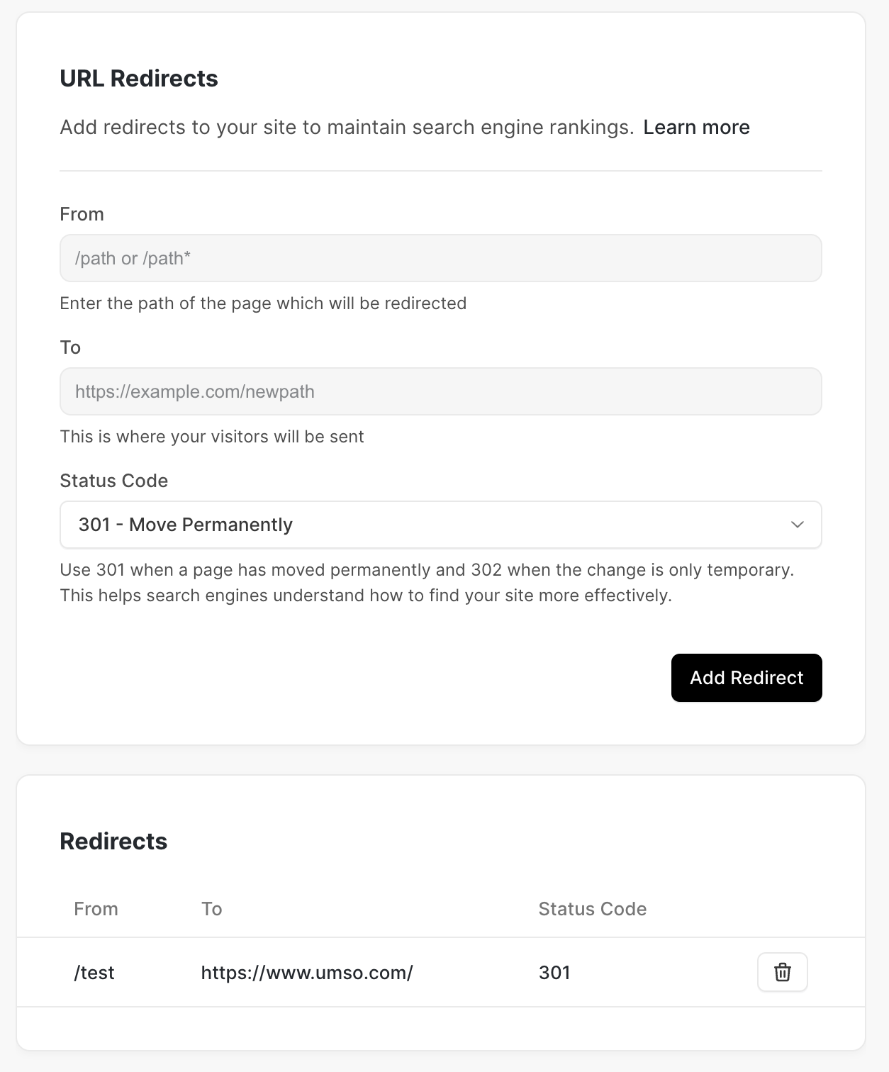 To create a new redirect fill in the form and click on "Add Redirect" on the right. In the "From" field, you enter the path of the page which will be redirected. The "From" path is relative to your site, so if your domain is example.com, then the settings in the screenshot below will apply to example.com/my-old-url.
