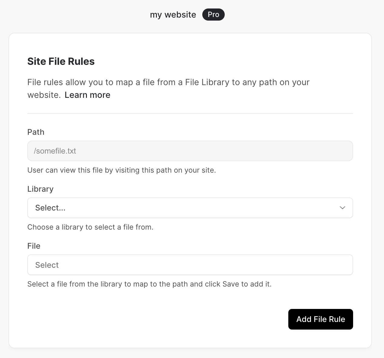 File rules allow you to map a file from a File Library to any path on your website. You can find this setting on your Site Settings under "Files".