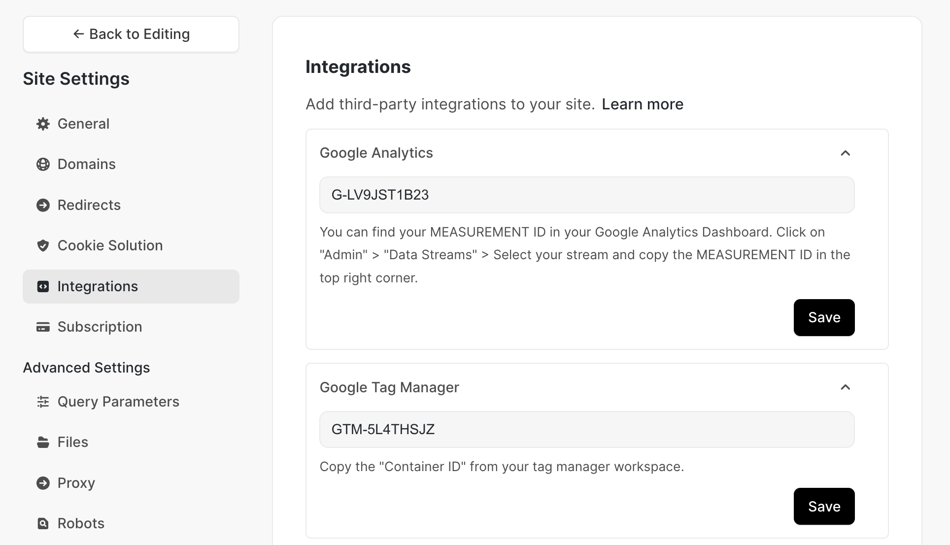 - New Editor: Visit Site Settings > Third Party Integrations.