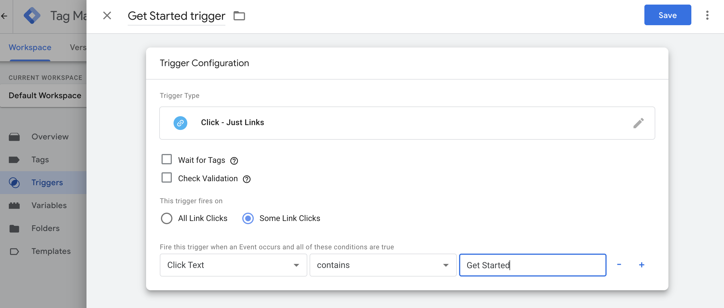 Select "Some Links Clicks". In the picker, choose "Click Text", then type "Get Started" (or your button's text).