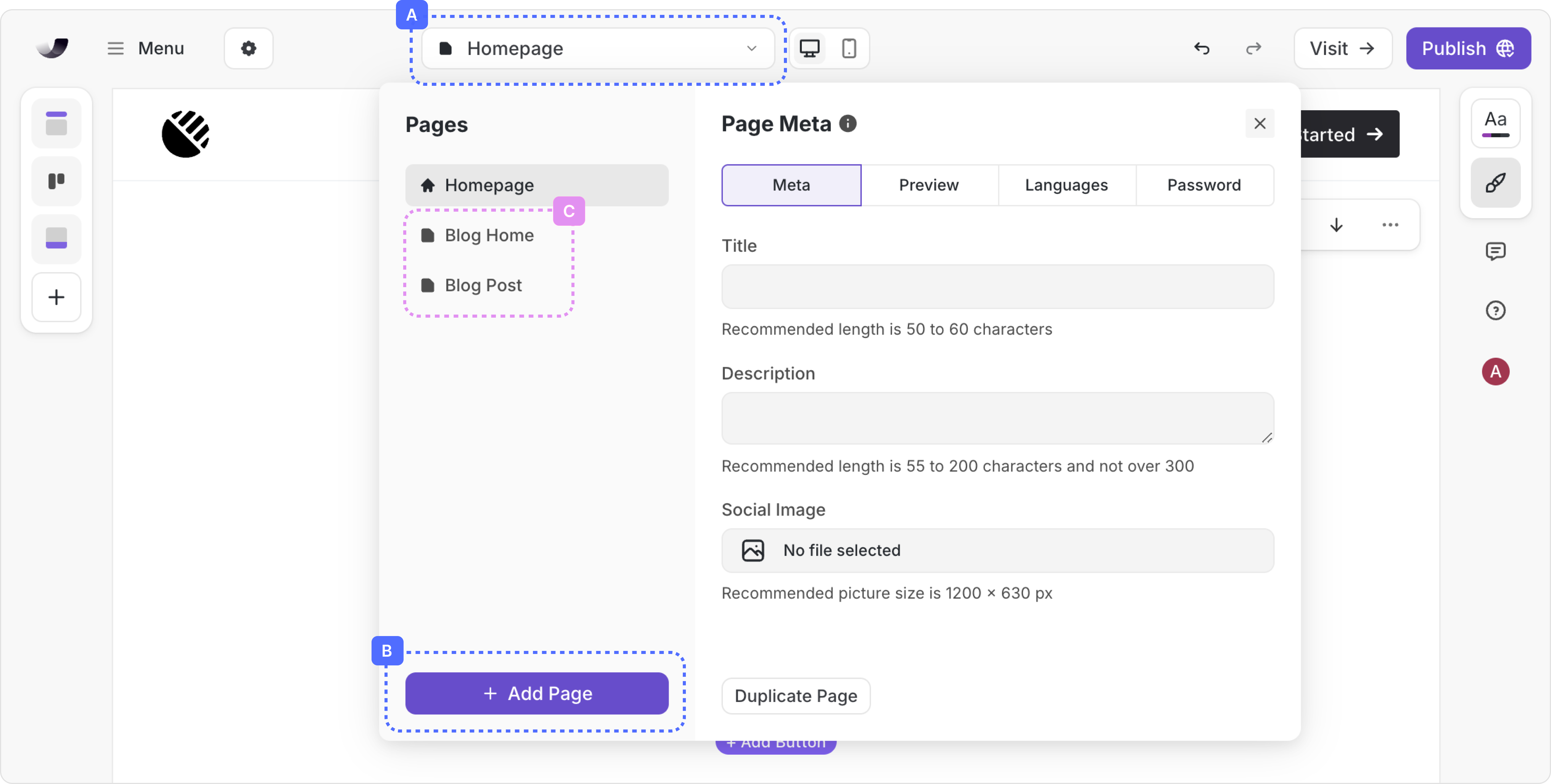 To add a blog to your site, open your site in the editor and open the page picker (A). Then click on "Add Page" (B).