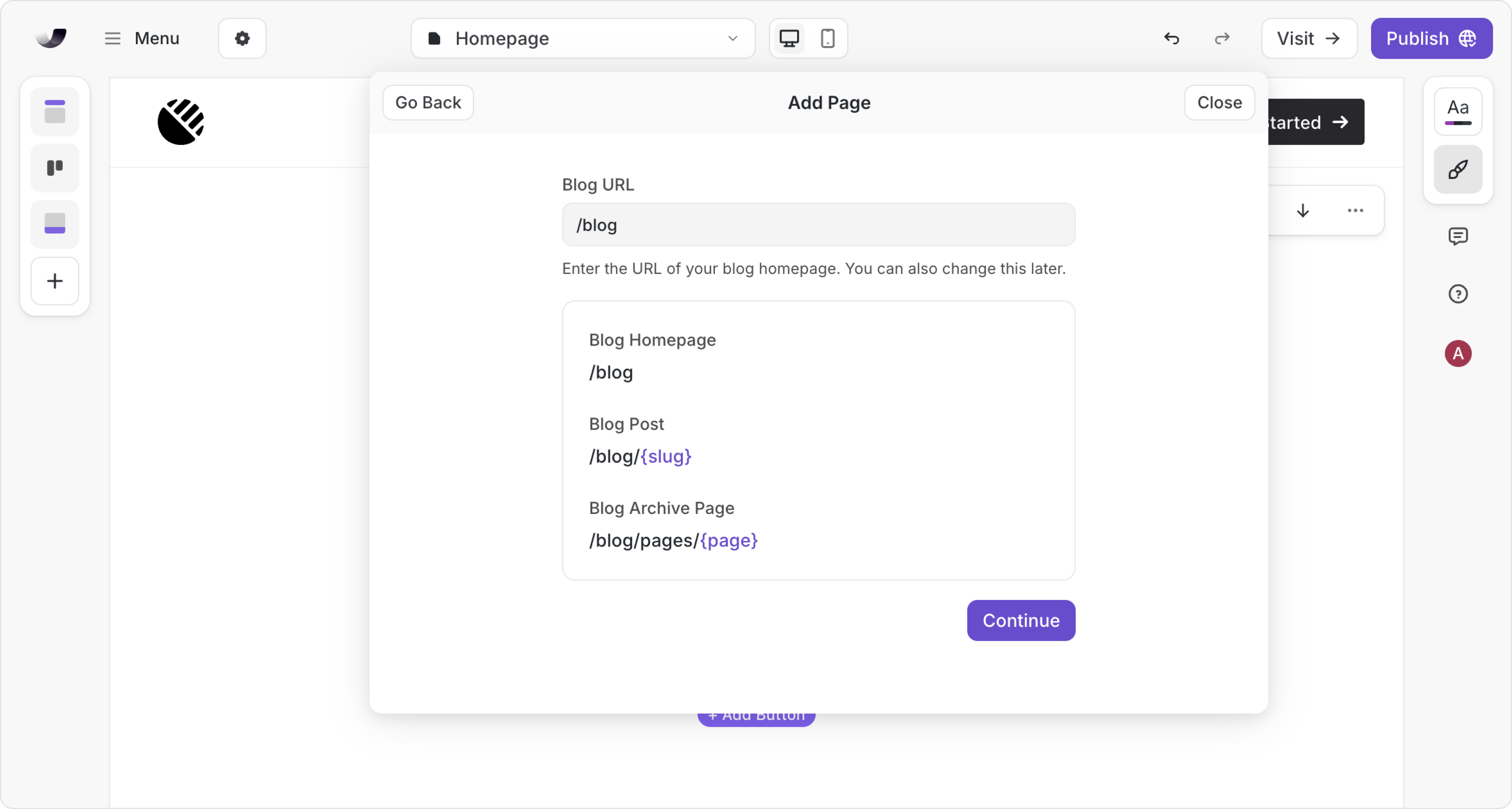 Enter the base path for your blog setup. We will then create three new pages for you: the blog homepage, the blog post page and the blog archive page. You can change these urls after creating them page.
