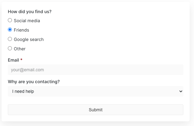 In Form Fields, you create and edit all the fields in your form. You can choose between Text Field, Email, Phone, URL, Number, Text Area, Checkboxes, Radio Buttons, Select and Upload file. You can also select "None" to hide the input field. Below are three examples of Radio Buttons, Email, and Select.