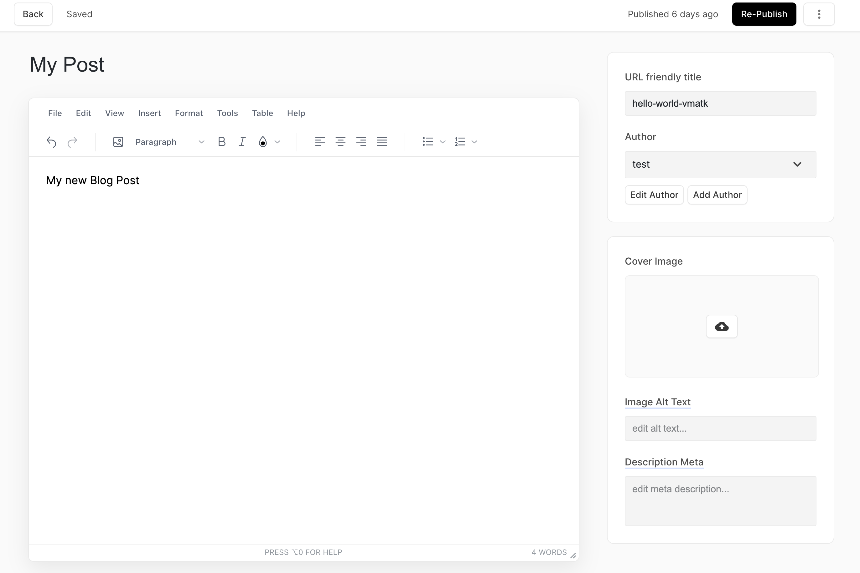 When creating a post for your blog, you will use our blogging system editor. It is a basic but powerful editor that allows you to add images, meta tags for your post, cover image, schedule a post publishing and etc.