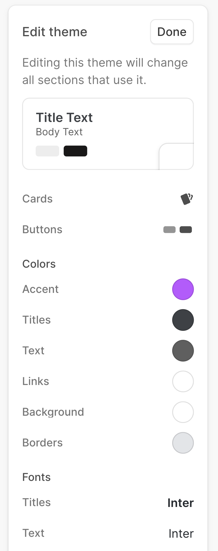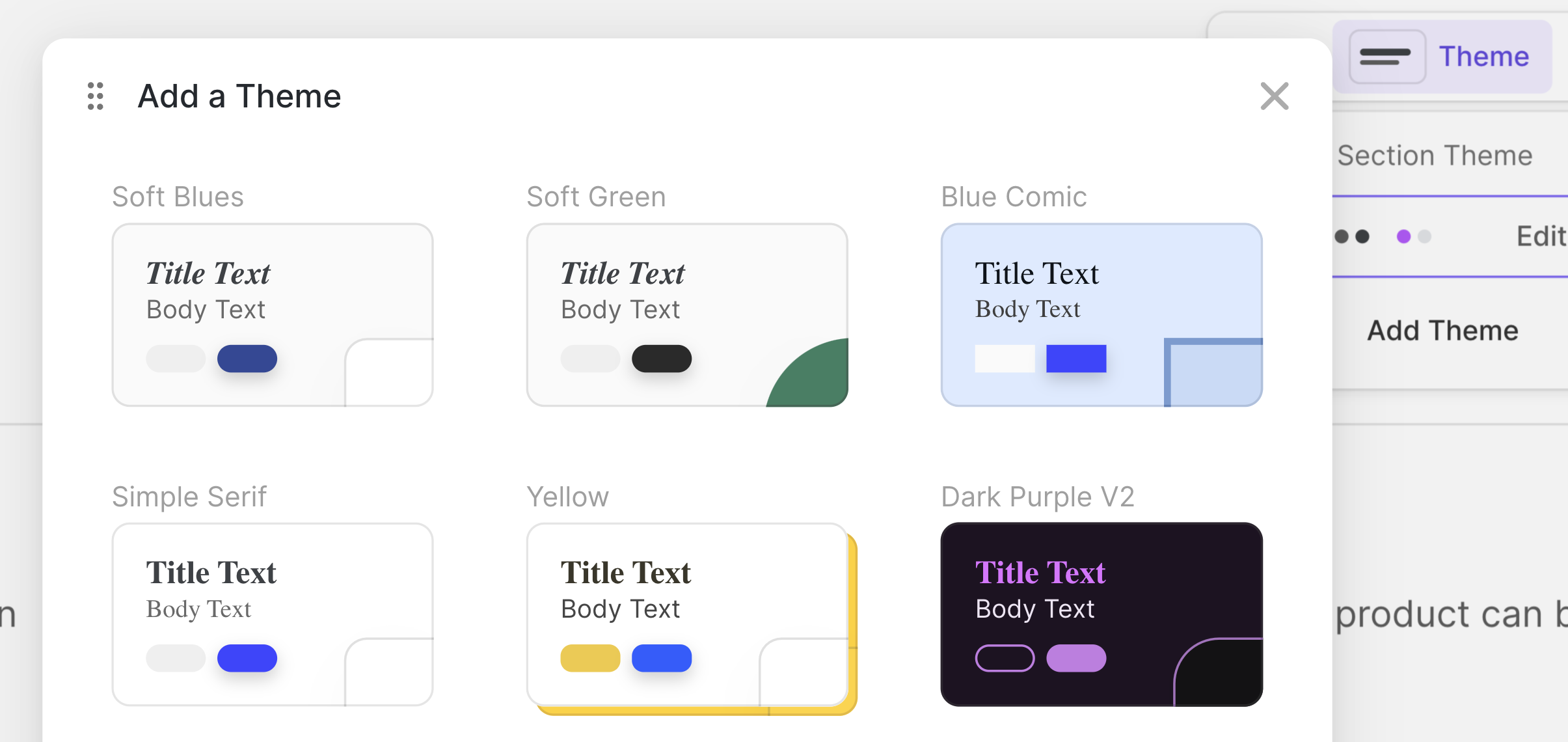 Themes are a collection of colors, fonts, card, and button styles to help you design your websites. Themes help to design your website quickly and keep everything consistent.