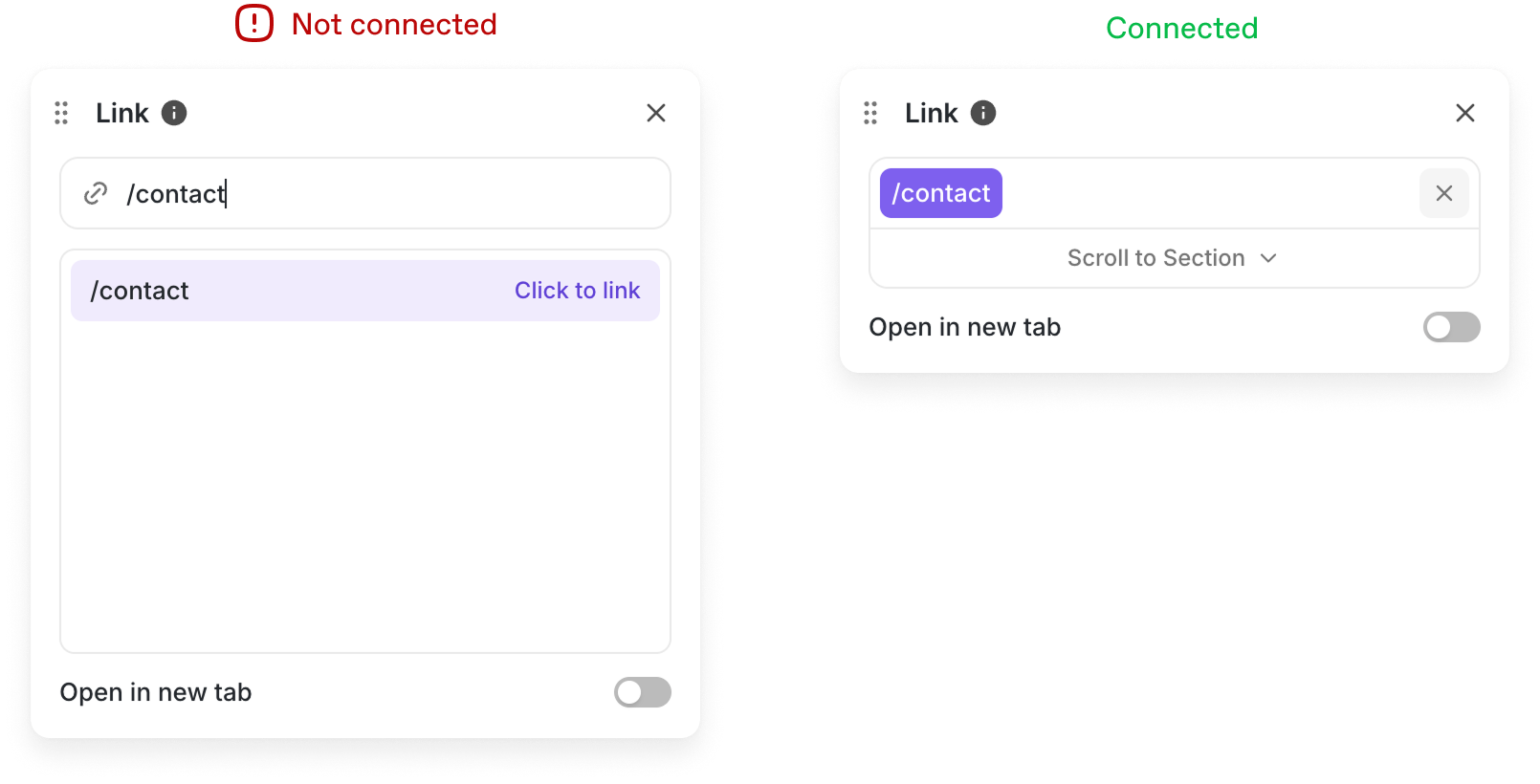 When adding an internal link, it's important to click the page to ensure the link is connected. By connecting the link to your page, you get automatic multilingual support and your link won't break if you change the url of your page.