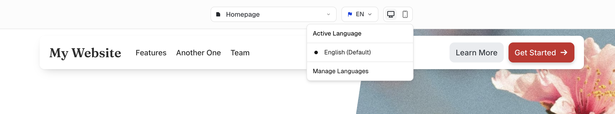 First open your website in the editor, and click on the language picker in the header. The language picker is next to the page picker and has a blue little flag followed by a two-letter language code of the current language.