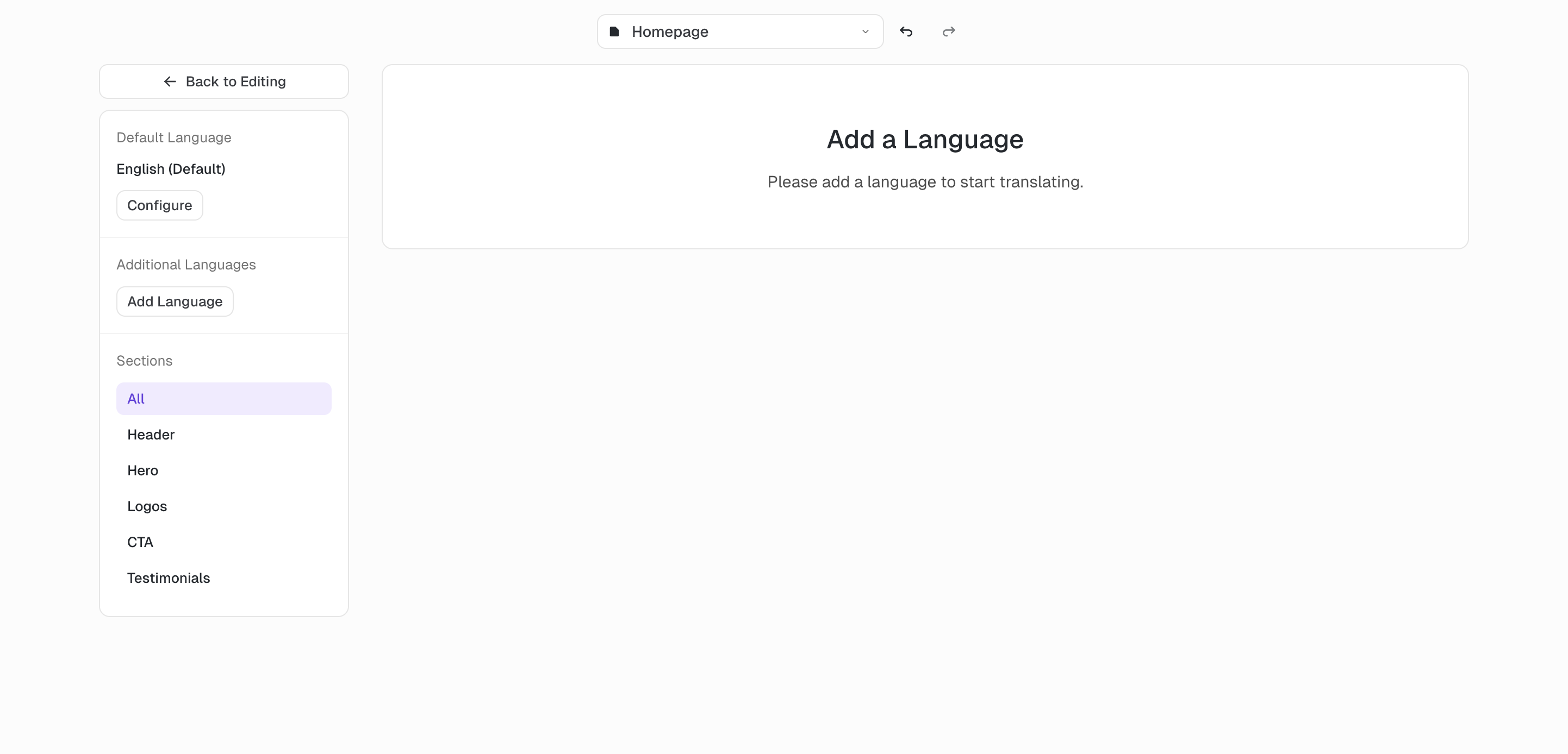 Once your page has at least one additional language, you can start translating. You'll see the content in your Default Language along with the content of your selected Additional Language.