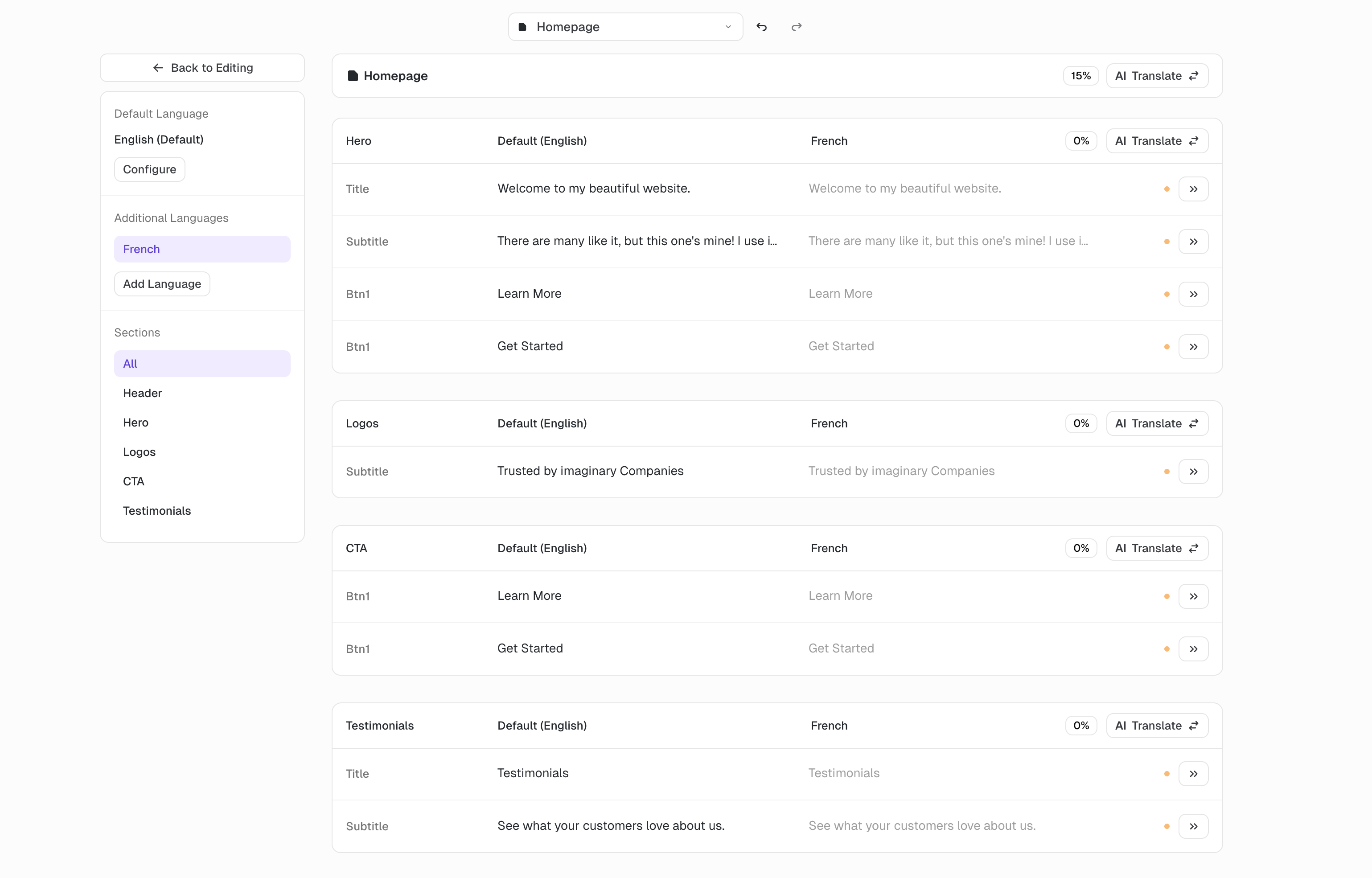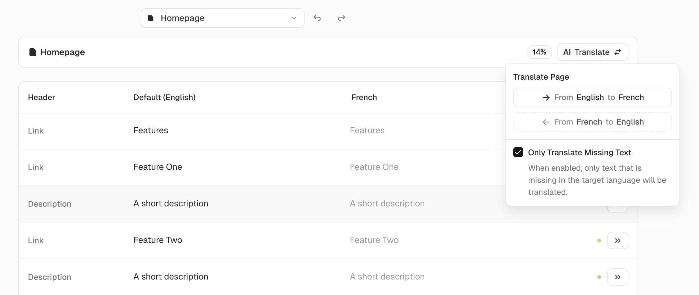 The easiest way to translate your page is to click the "AI Translate" button on top of the page. Next to the button you see the percentage of the page that is already translated.