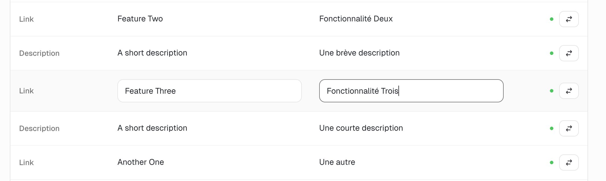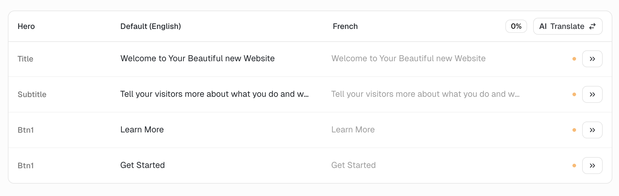 Sometimes you might want to manually translate content or make changes to the AI translation. To do that, simply click the row you want to edit and you will be able to change both the default language and your translation.