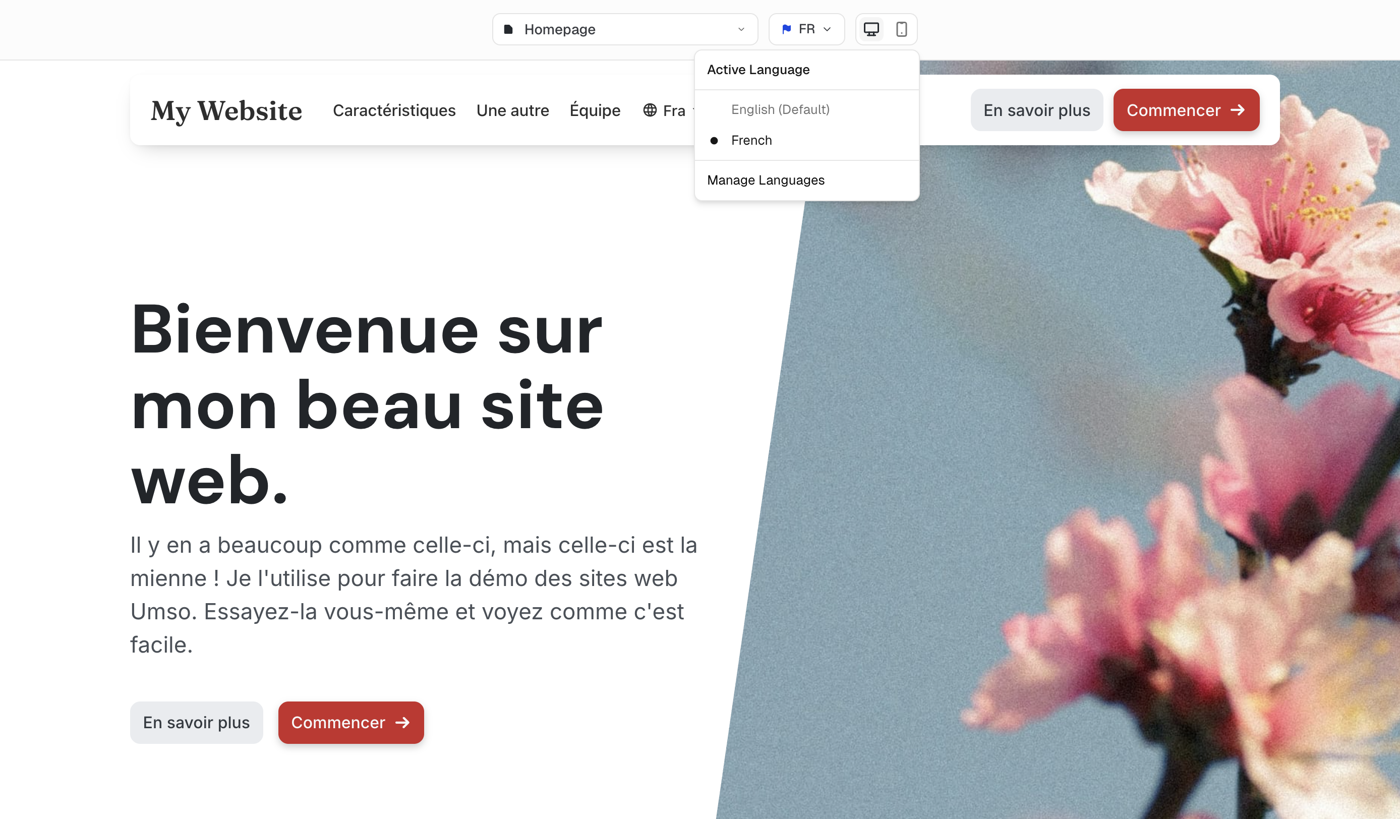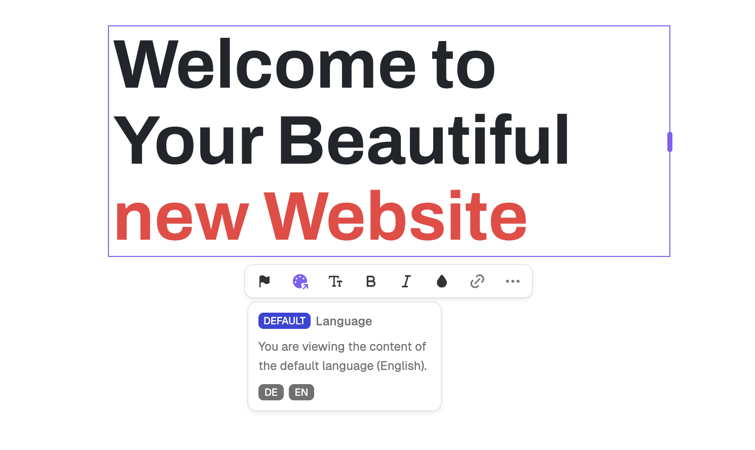 When there is no translation available for a certain language the default language will be shown both in the editor and on your live site. In this example the default language is English and the current language in the editor is French.